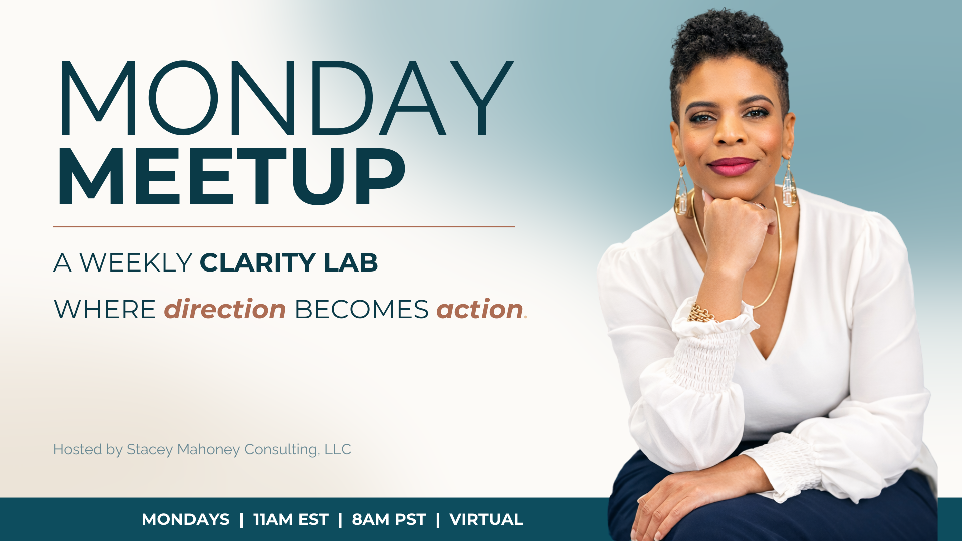 Monday Meetups are facilitated by Stacey Mahoney, an award-winning, international speaker and leadership development coach who works with senior leaders and professionals navigating complex transitions.